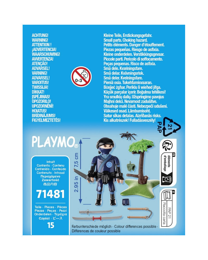 Set includes 1 ninja figure, 1 spider, 1 tree, 1 katana, 1 nunchaku, 1 knife and 1 samurai sword.