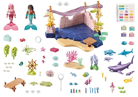 1 mermaid, 1 merman Animals: 1 shark, 3 small seahorses, 1 crab, 1 lobster, 1 starfish, 2 baby turtles, 1 sea turtle, 1 baby seal, 1 baby swordfish, 1 ray, 1 moray eel, 1 spadefish, 1 butterflyfish Accessories: 1 underwater caring station with different plants, 1 underwater plant, 1 coral with wather plants, 1 grassy area, 1 lantern, 1 wooden table, 1 steering wheel with storage options, 2 pairs of arm cuffs, 1 leaf belt, 1 toothbrush, 1 mirror, 1 stetoscope, 1 file box with 4 files, 1 basket, 1 case, 1 set of op cutlery, 3 neck braces, 7 bandages, 1 baby bottle, 3 cosmetic bottles, 1 glass with lid, 2 flowers, 2 leaf bundles, 2 grass bundles, 2 decorative shells with suction cup, 1 snail shell, 1 sticker label with plasters and bandages