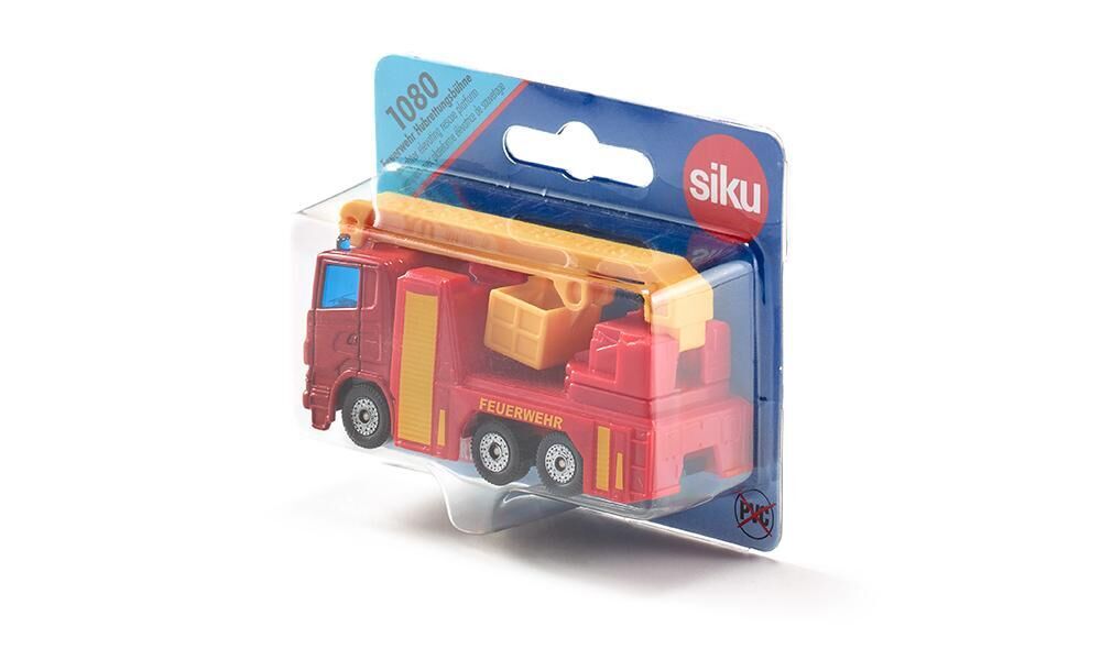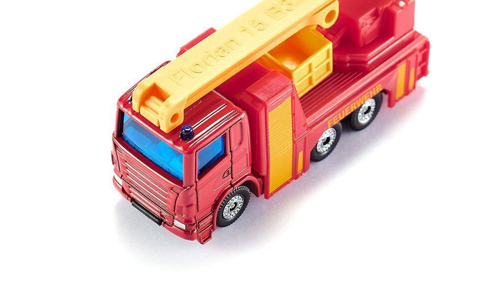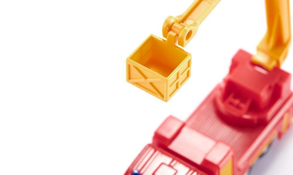 Fire on the fourth floor, and no escape is possible via the stairs then the fire brigade rescue platform arrives on site at the emergency. Just like the full-scale prototype, the boom rotates, the basket pivots, and the elevating rescue platform can be folded out. The siku fire brigade elevating rescue platform dashes to the emergency on a 3-axle chassis with a metal cab.