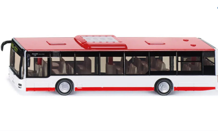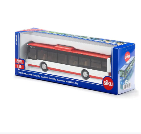 Very detailed bus model to original design of MAN Lions City to 1:50 scale. Wheels with rubber track. 2 axles, second axle with twin tyres. The 2 right-hand doors open. Engine bonnet opens at rear. Tinted windows. Separate rear mirror and integrated radiator grill. Plastic front and rear lights. Roof with air-conditioning.