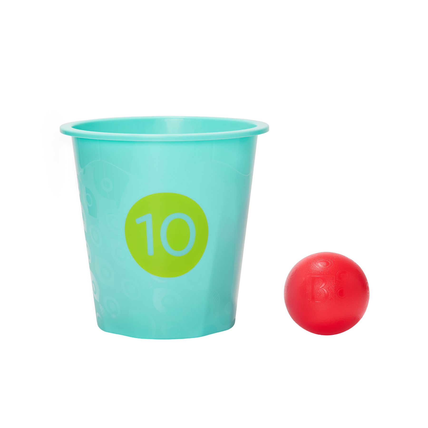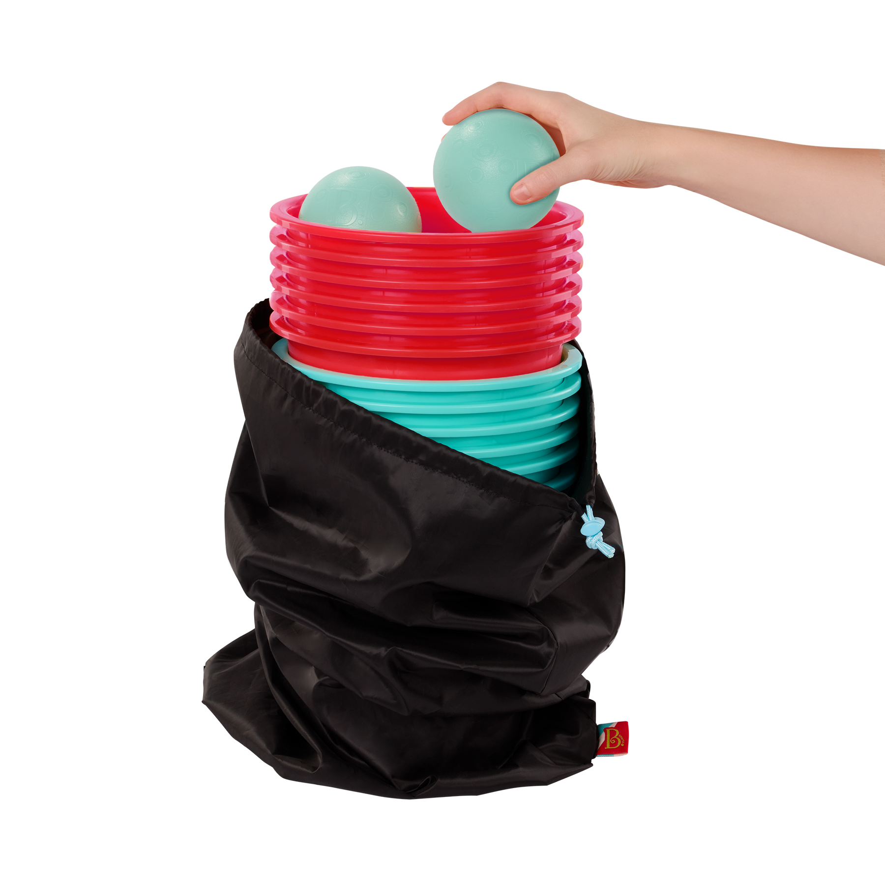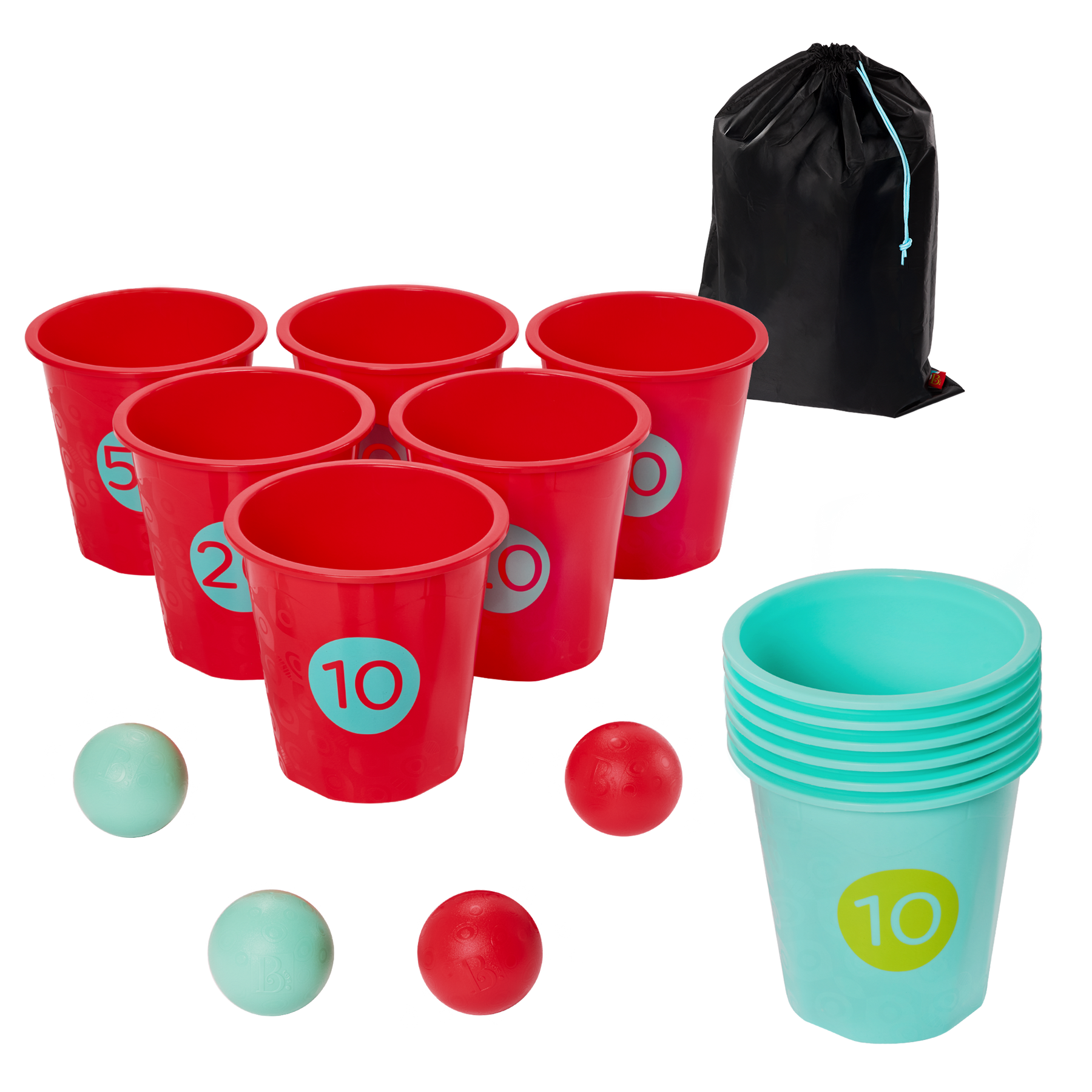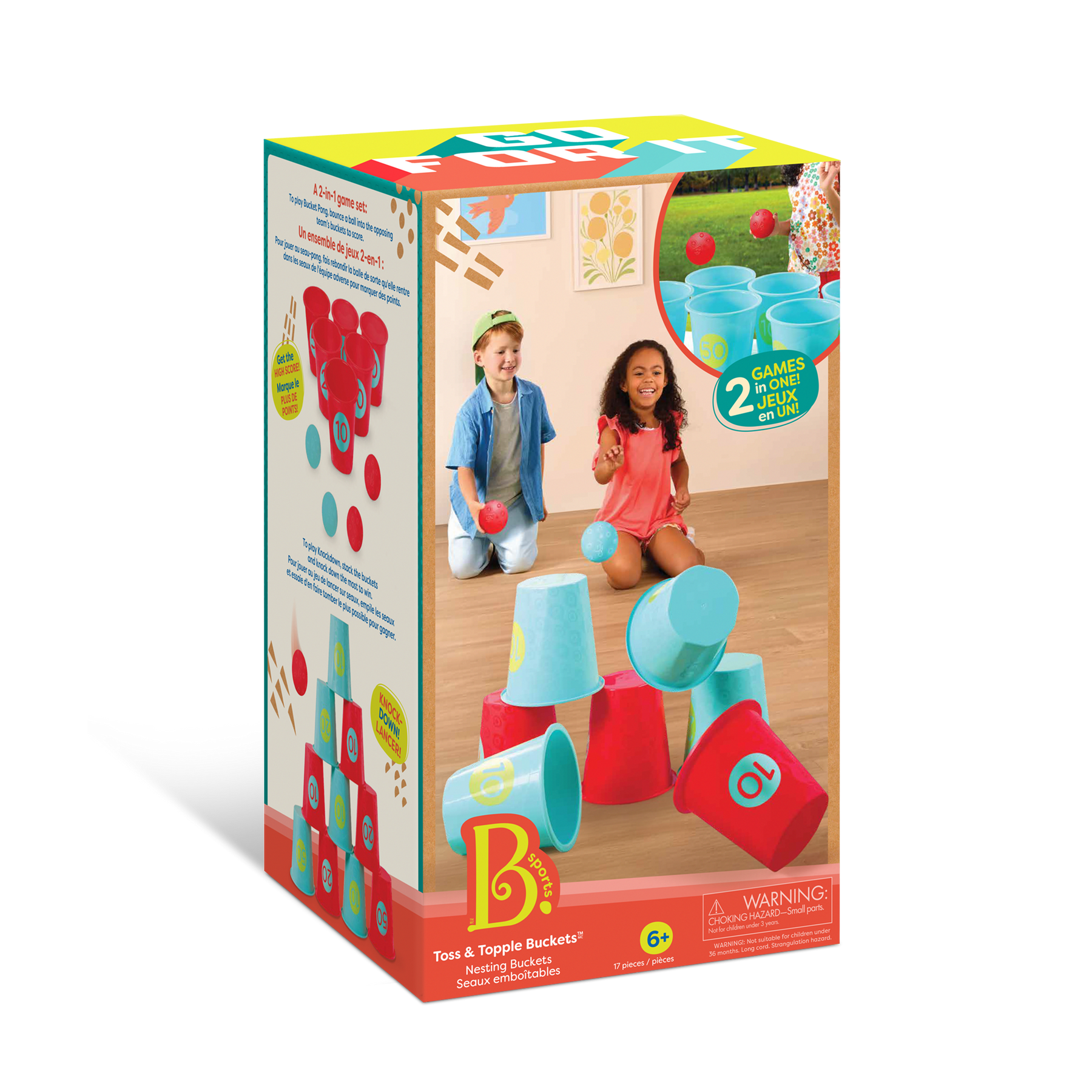 Score a full day of family fun with the Toss & Topple Buckets set from B. toys! This outdoor set includes 12 nesting buckets in two colors, 4 balls, and a mesh storage bag for easy transport. The perfect companion to a day at the beach or a backyard BBQ, Toss & Topple Buckets includes rules for the crowd-pleasing game of Bucket Pong or a classic carnival game of Knockdown! Set up a friendly contest in seconds, thanks to 6 buckets in each color and points marked on each bucket. And clean up is a breeze thanks to the nesting buckets and mesh bag – no need to worry if things are bit wet or sandy, just toss 'em in. All-day family fun awaits and new high-scores await!