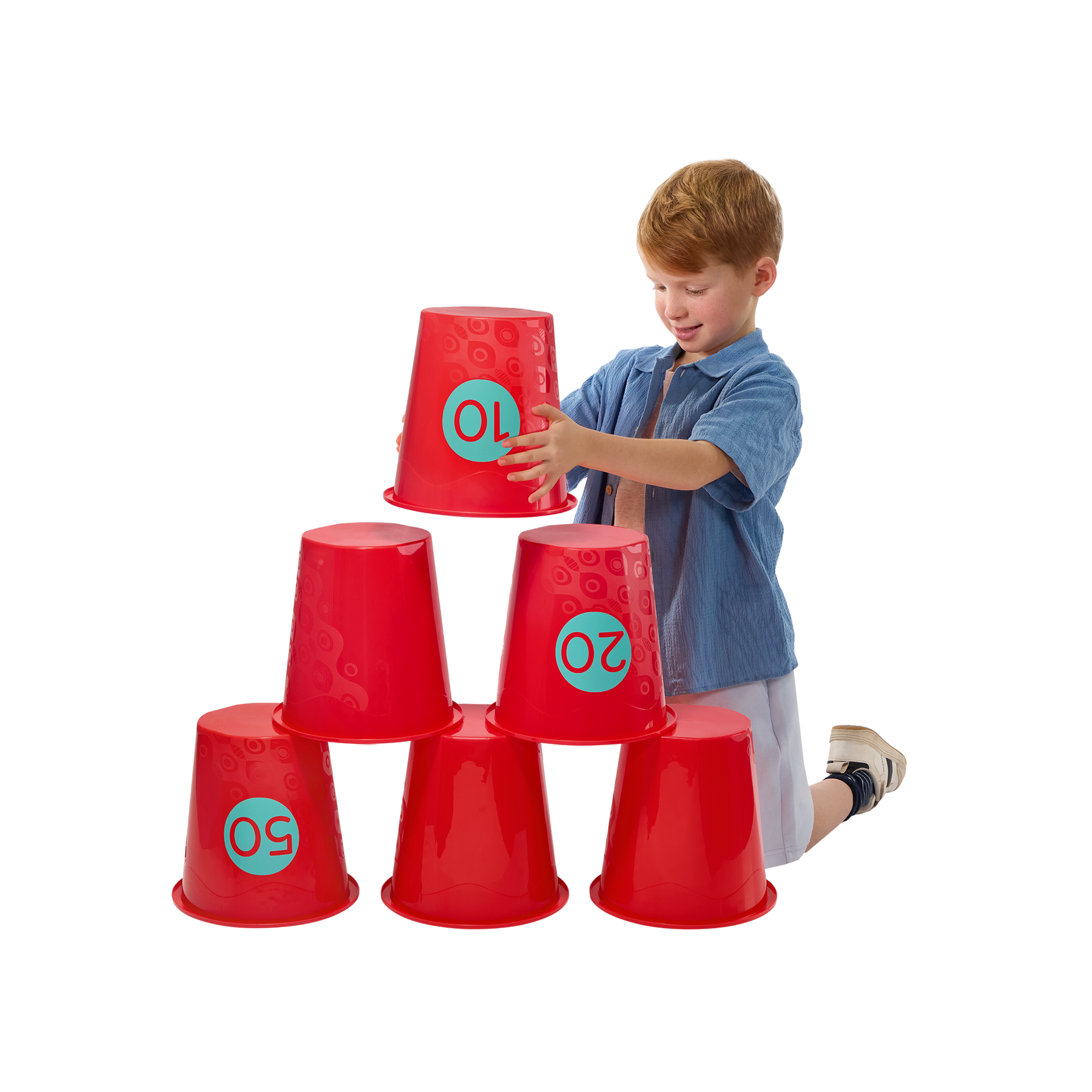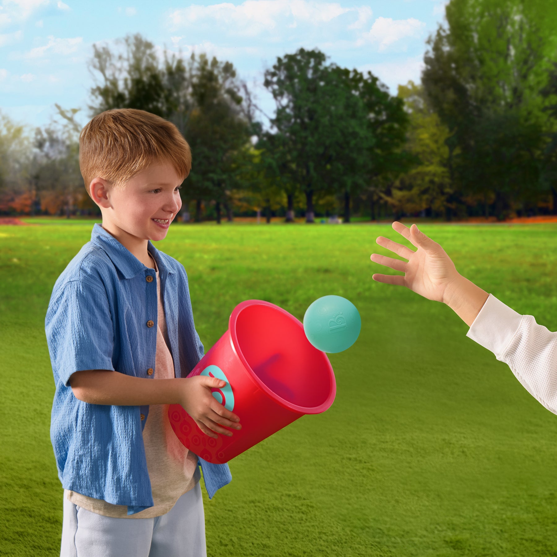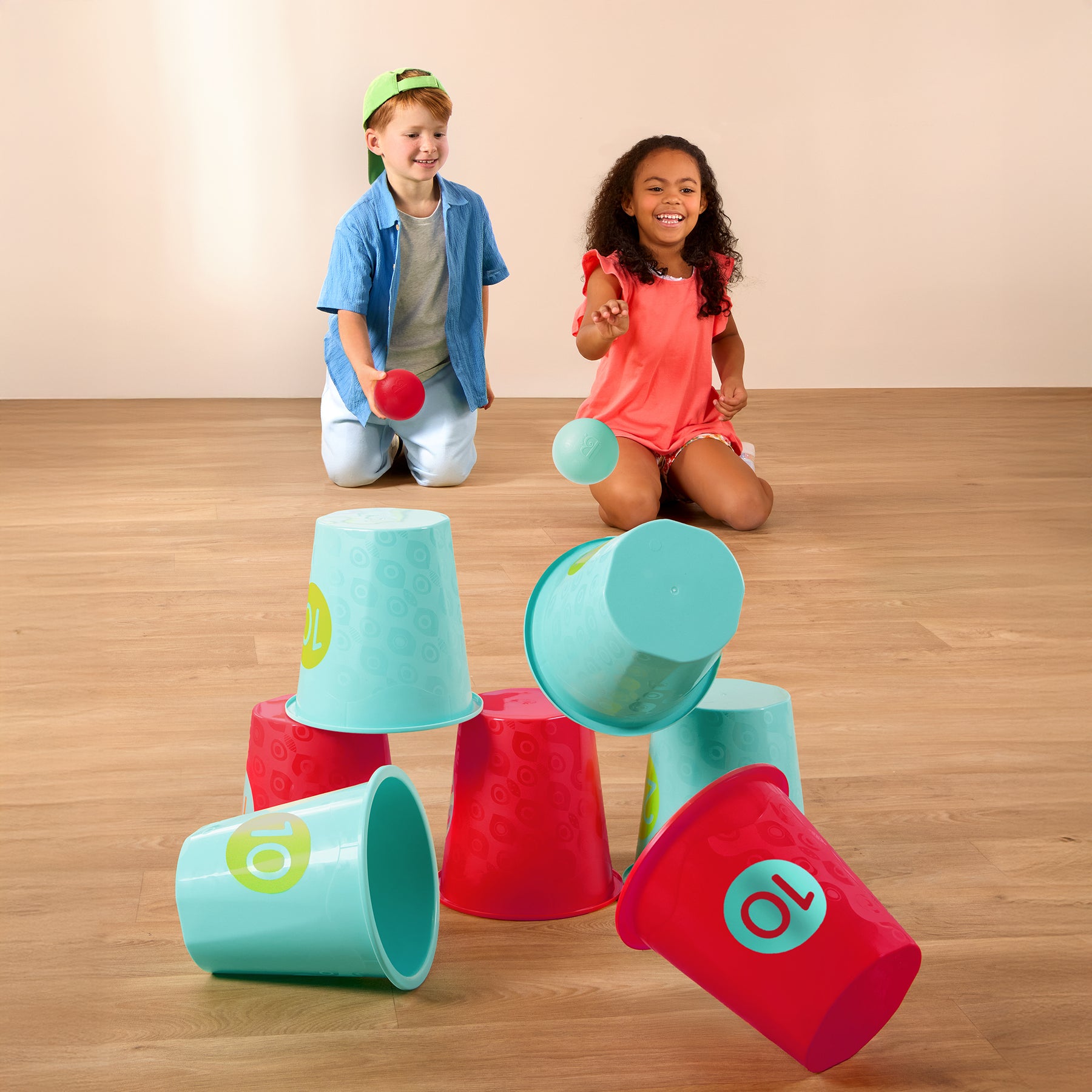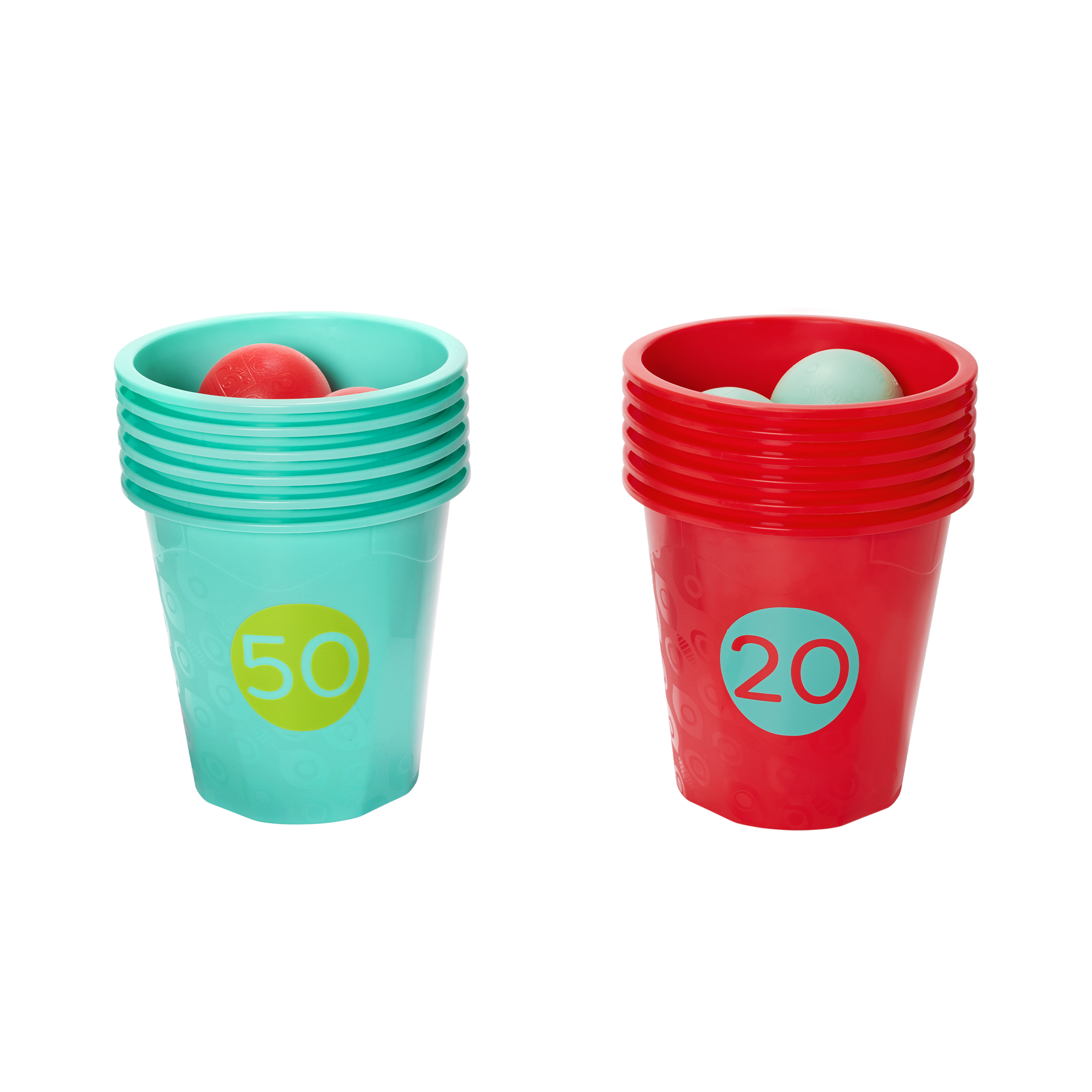 Score a full day of family fun with the Toss & Topple Buckets set from B. toys! This outdoor set includes 12 nesting buckets in two colors, 4 balls, and a mesh storage bag for easy transport. The perfect companion to a day at the beach or a backyard BBQ, Toss & Topple Buckets includes rules for the crowd-pleasing game of Bucket Pong or a classic carnival game of Knockdown! Set up a friendly contest in seconds, thanks to 6 buckets in each color and points marked on each bucket. And clean up is a breeze thanks to the nesting buckets and mesh bag – no need to worry if things are bit wet or sandy, just toss 'em in. All-day family fun awaits and new high-scores await!