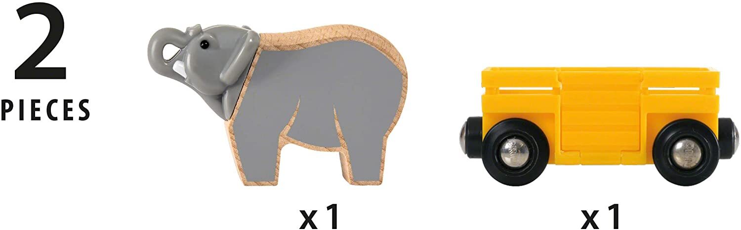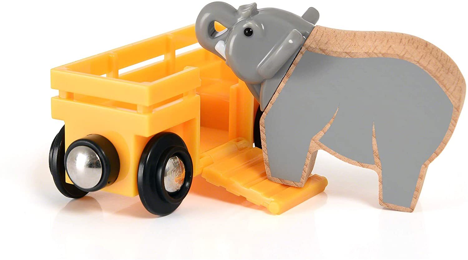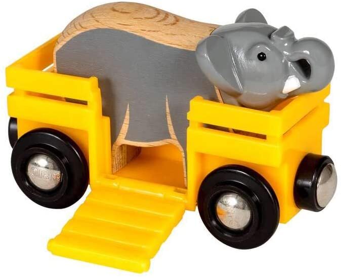 The Elephant and Wagon let you connect to a BRIO World toy train and safely transport the elephant across the savannah plains or any other BRIO World destination. Transporting wild animals can be hazardous, so this sturdy wooden train wagon is built to carry even the most ferocious beasts. The powerful elephant with its wooden body fits snugly into the sturdy yellow wagon, which has a loading bridge and magnetic connectors at either end for easy coupling and decoupling.