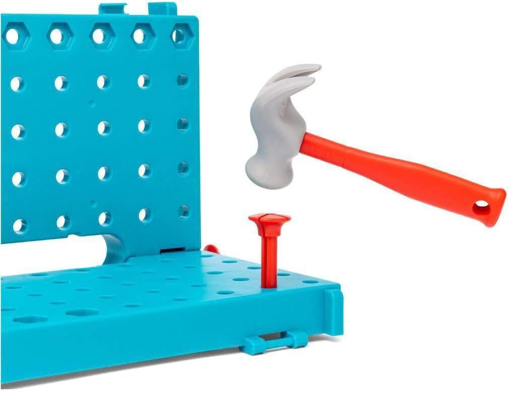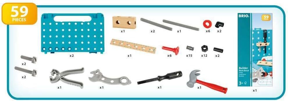 The BRIO Builder Work Bench includes 59 pieces; 1x Working Bench/Toolbox, 1x Hammer, 1x Screwdriver, 1x Plier, 1x Wrench, 1x Ruler, 52x Play Components and 1x Instruction Manual.